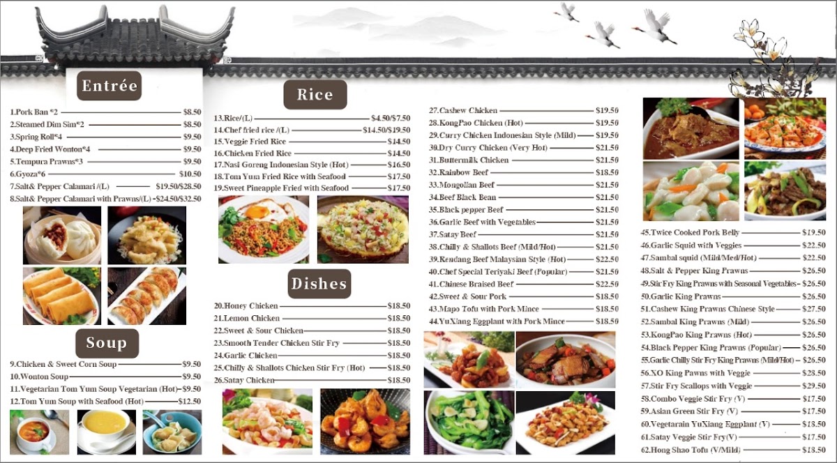 The noodle selection is equally impressive, featuring dishes like the Satay Chicken Noodle and Curr Laksa with Chicken and Prawns, known for their rich flavors and generous portions. For those craving something heartier, the signature Sambal King Prawns and Black Bean Beef will surely leave you satisfied.